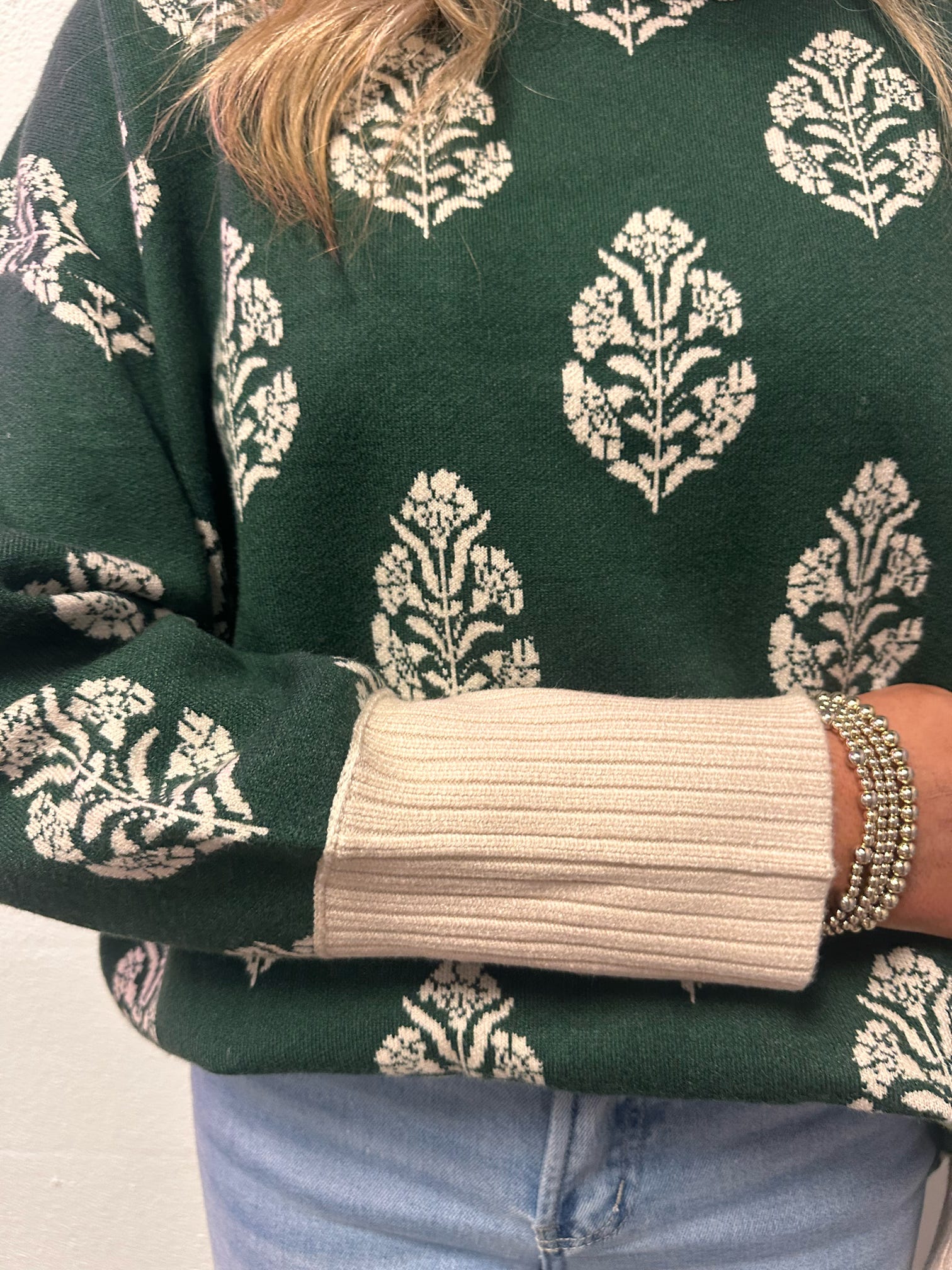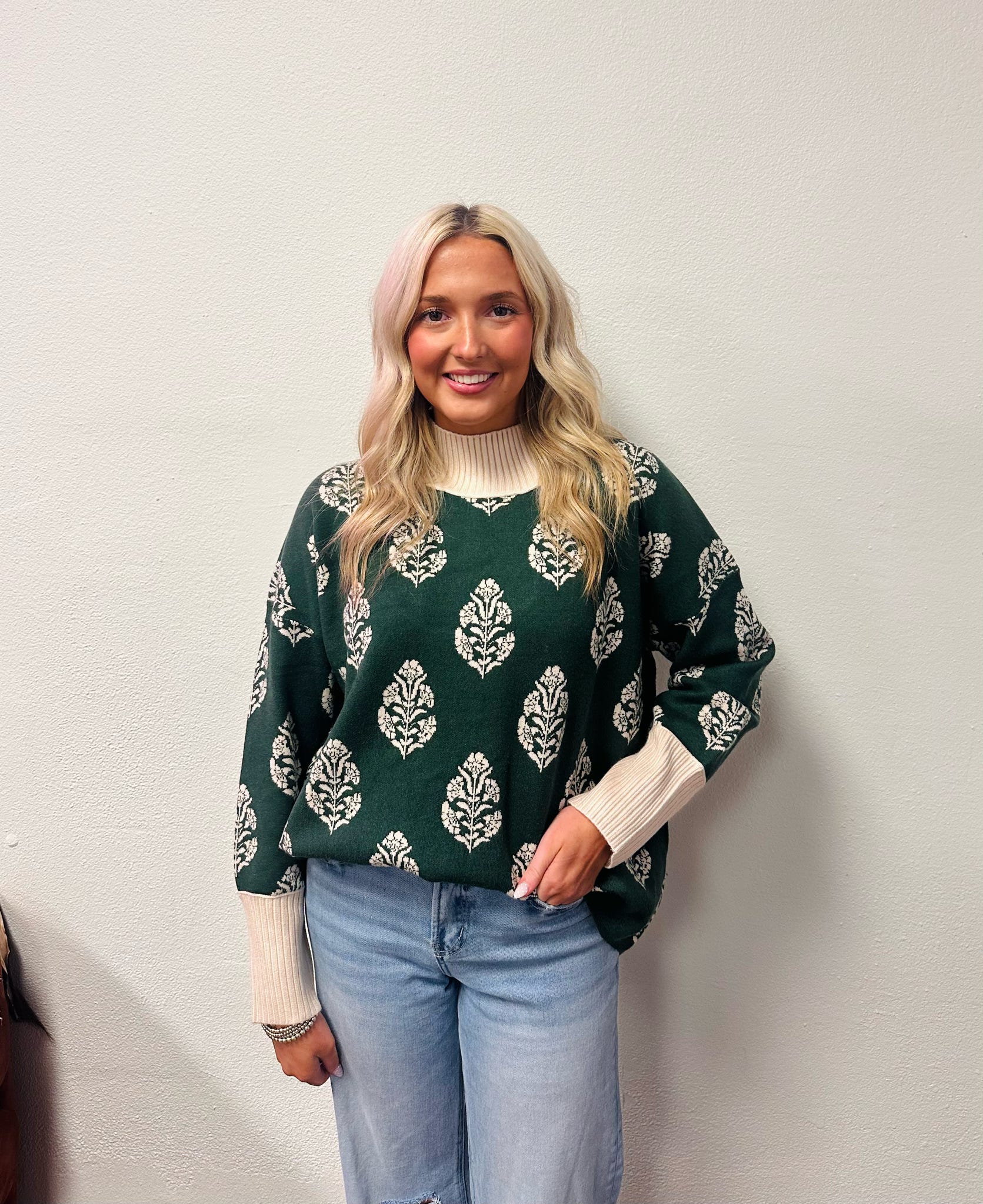 Andrea Soft LS Print Sweater w Contrast Mock Neck