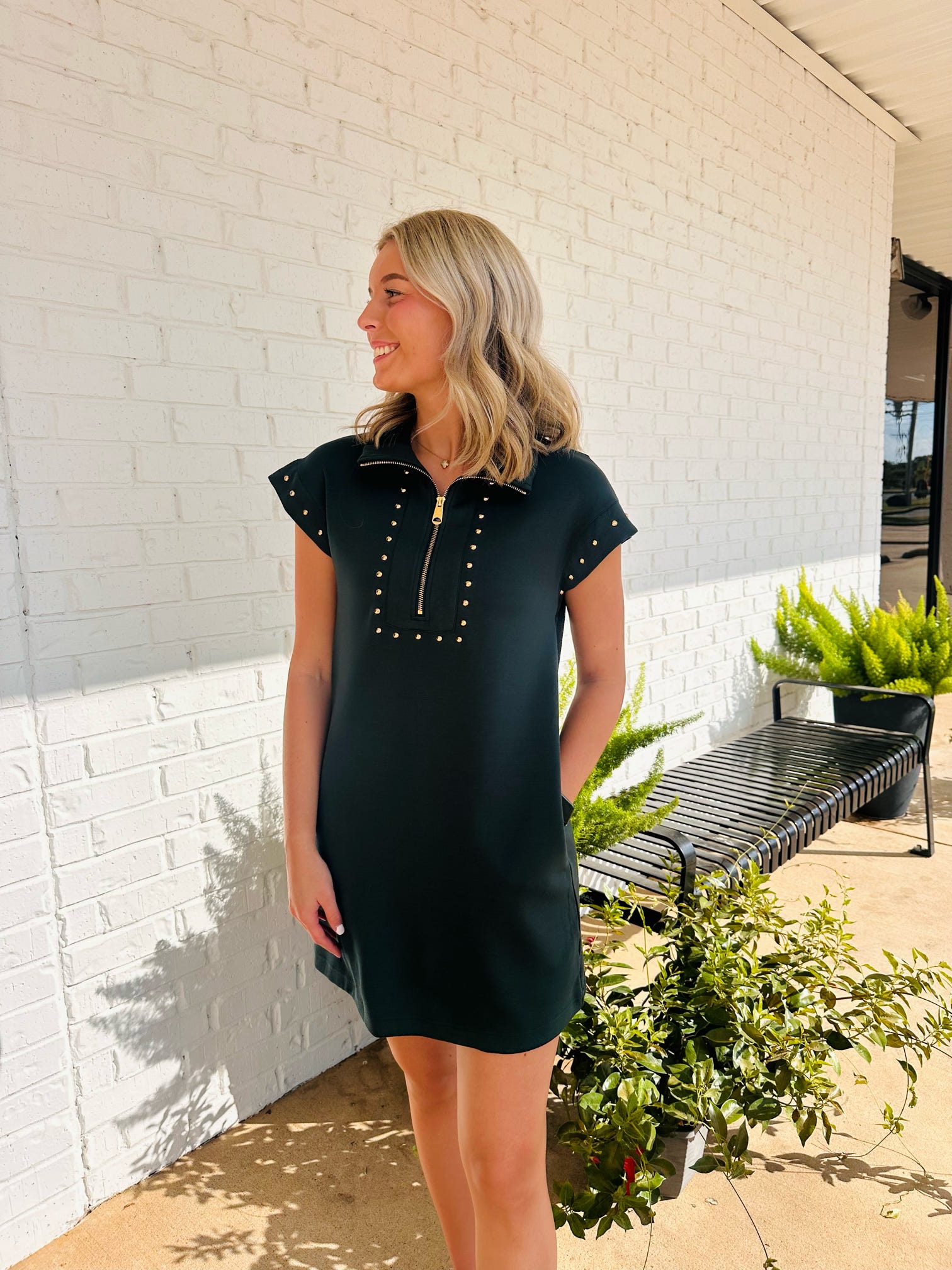 Rhodes Cap Sleeve Scuba Studded Zip Collar Mini Dress