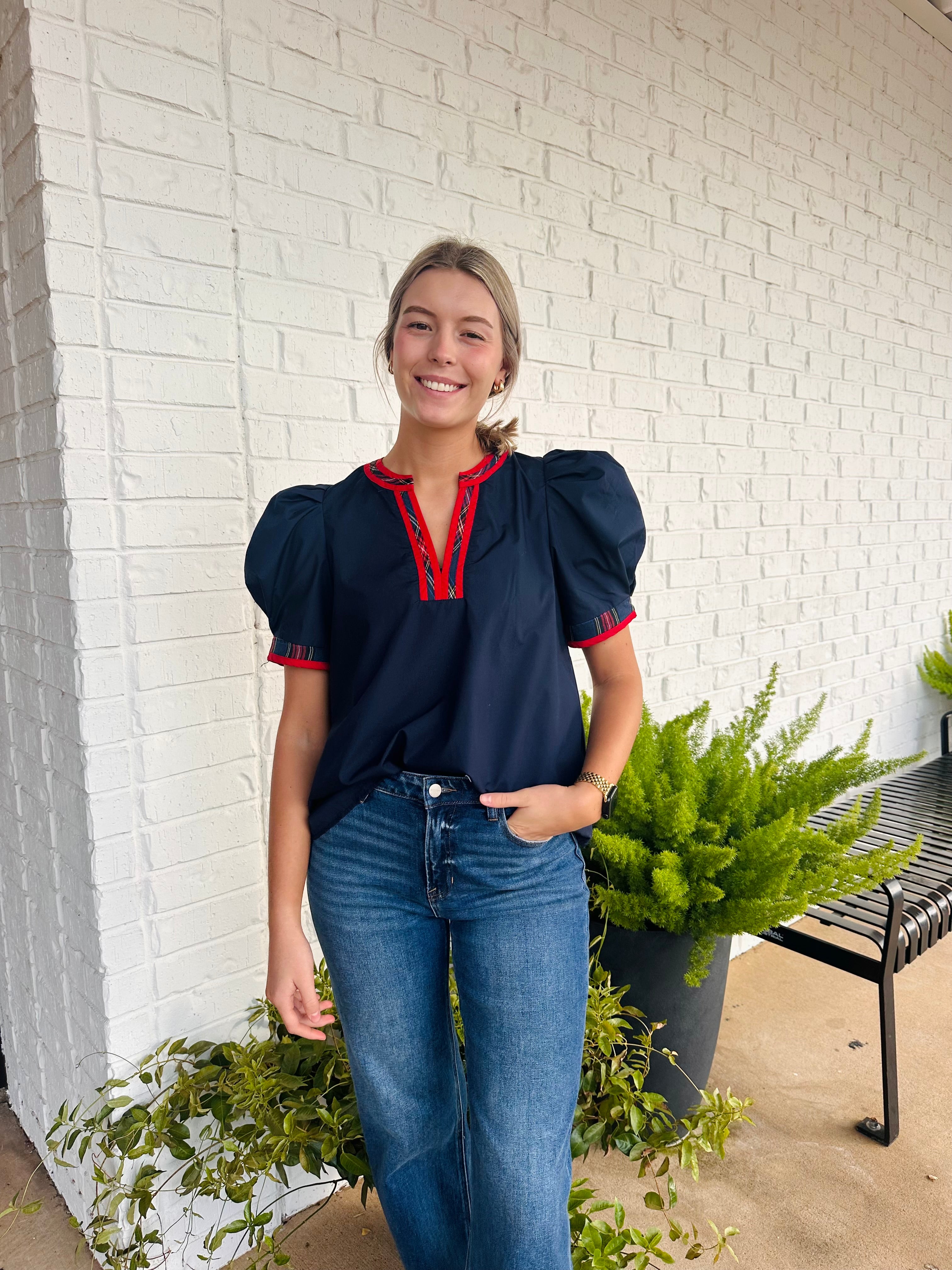 Holly Plaid Accent V Neck Short Puff Sleeve Top